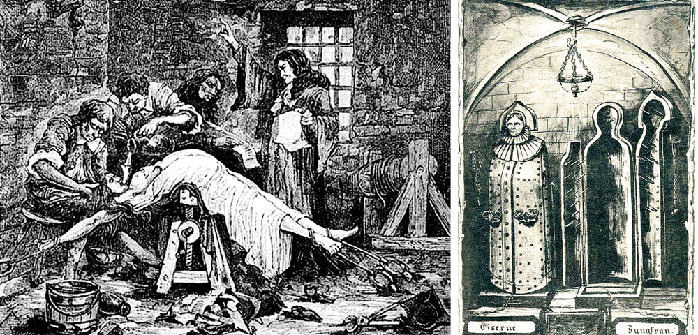 성모 마리아의 모습으로 제작된 고문 도구, 사람을 가두고 문을 닫으면 내부의 쇠창살에 찔려 죽는다. 이단자가 그 안에 들어가면 육체의 고통이 영혼을 정화시키며, 마리아가 그를 가톨릭 신앙과 교감하게 하고 모든 죄를 용서함을 상징한다고 한다. (출처: 위키미디어)